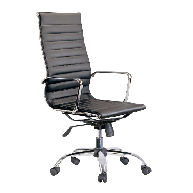 Respaldo tapizado en símil cuero. Giratoria, con ruedas, apoyabrazos y neumática. Estructura cromada.