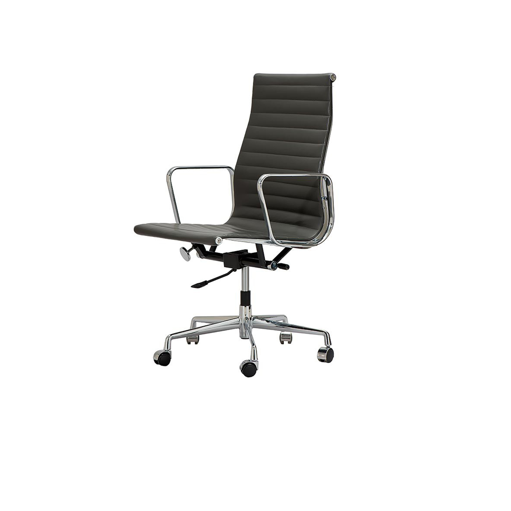 Estructura en aluminio fundido pulido, con y sin brazos, giratorio con movimiento neumático, con o sin basculante. Tapizado en cuero o símil cuero a elección.