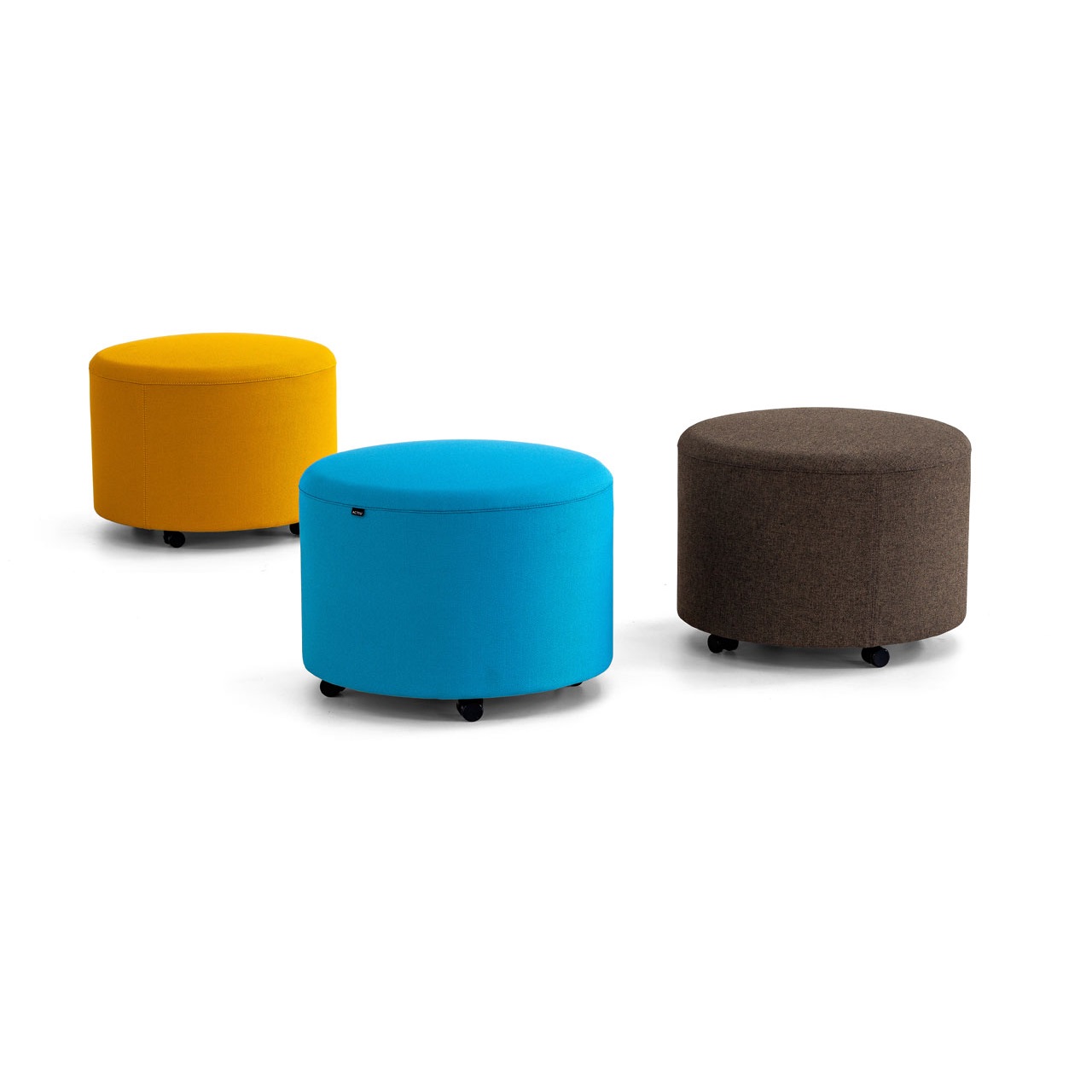 Banquetas redondas, estructura interna de madera cubierta con espuma inyectada de poliuretano flexible y base de ruedas Ø37mm con rodadura de teflón en acabado negro.