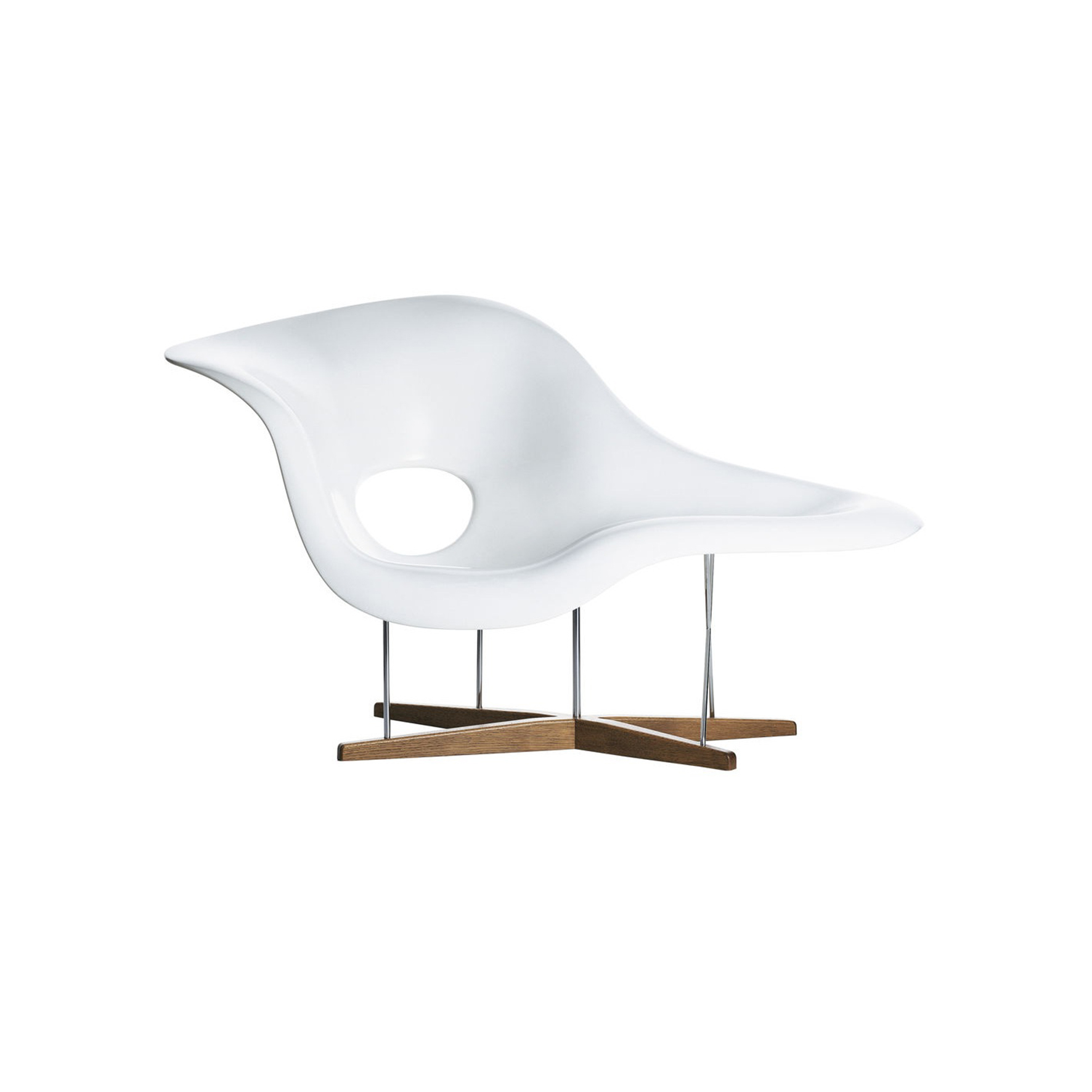 Base de madera de Roble, bastidor inferior cromado y carcasa blanca de espuma dura de poliuretano barnizado en color blanco.