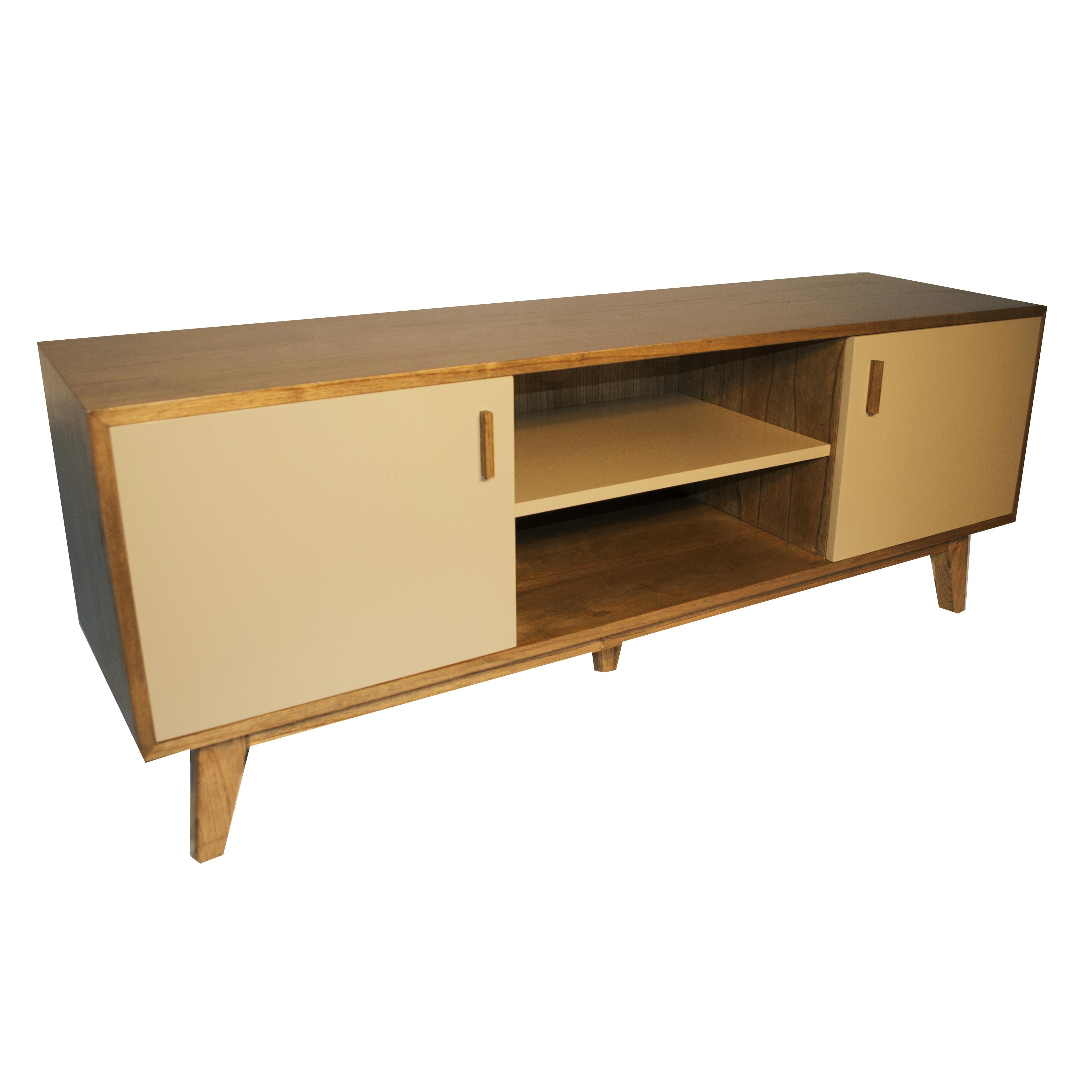Mueble TV fabricado en madera de paraíso, frentes en MDF laqueado. Dos puertas con estantes y hueco con estante central.