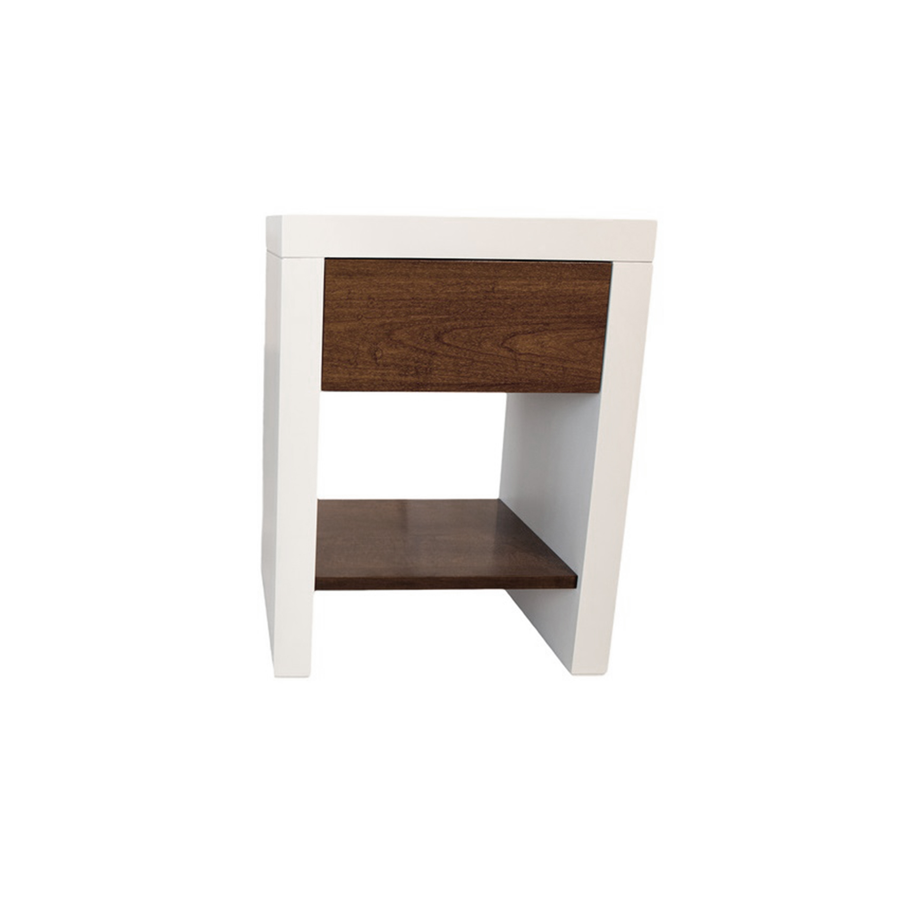 Estructura en MDF laqueado según muestrario, cajón y estante en madera de paraíso.