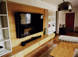 En este luminoso departamento, cambiamos el diseño de todo el living comedor. Se diseñó un rack a medida para la TV, con cajones para guardado y estantes.