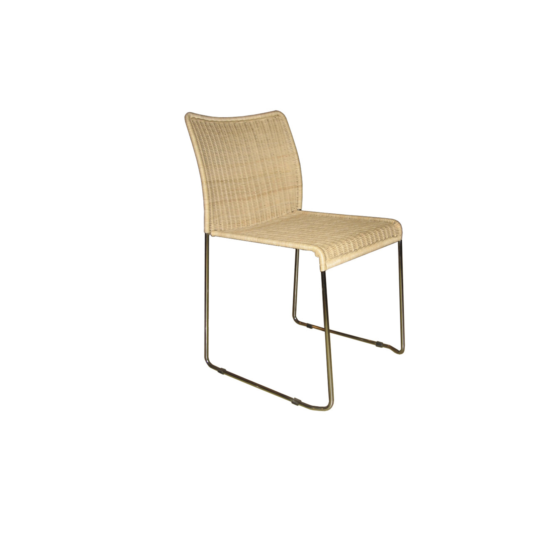 Estructura metálica cromada, asiento de ratán natural o sintético. Apilable.